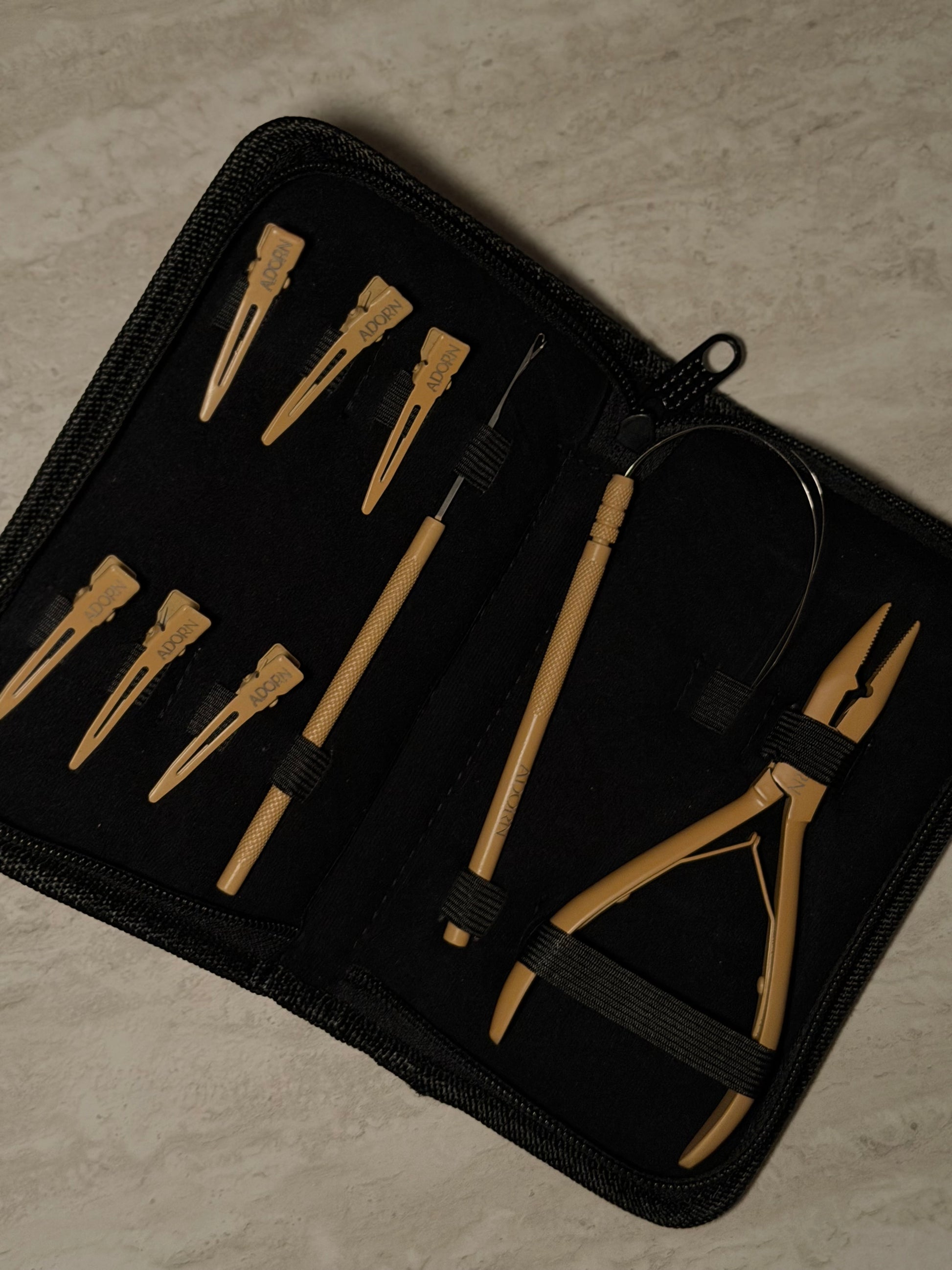 Designed for our signature No Sew Wefts, the Adorn Mini Essential Kit features the core tools needed for clean, efficient installs in a sleek, compact format. Ideal for travel, touch-ups, or stylists who prefer a streamlined setup, this kit delivers professional performance without the bulk.